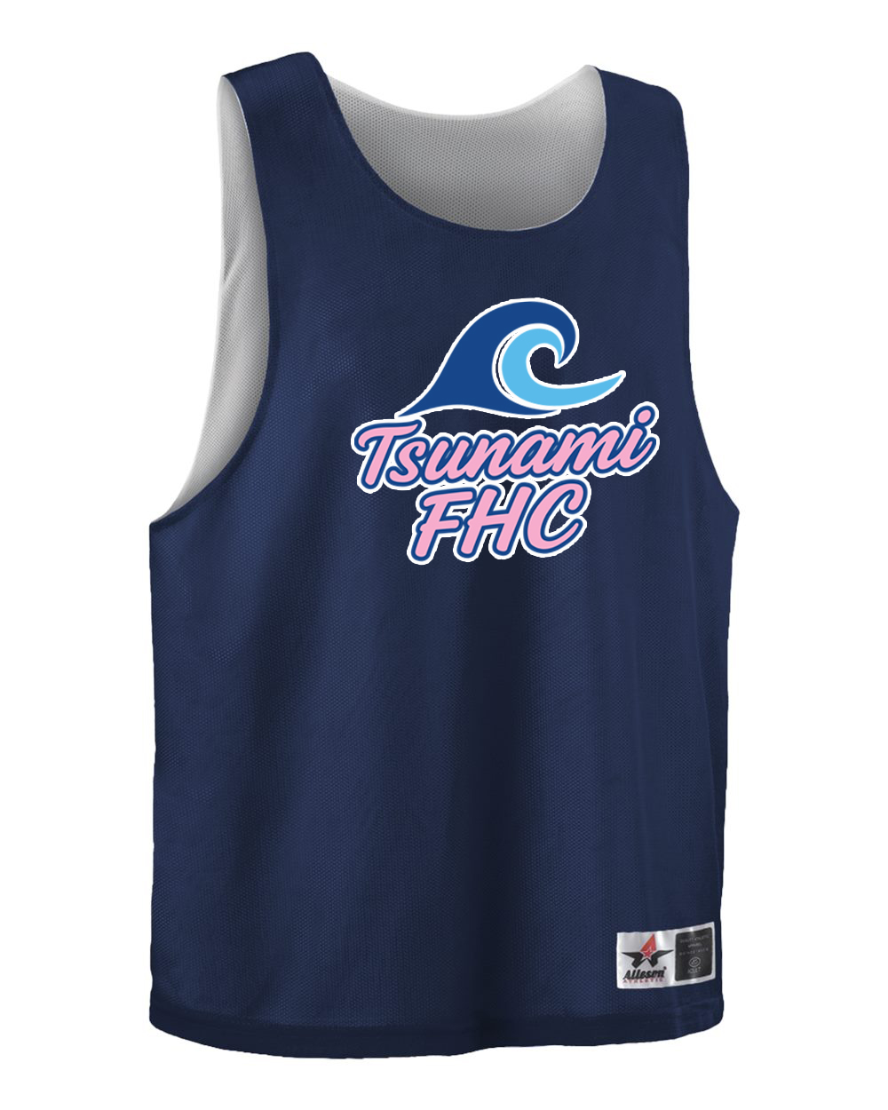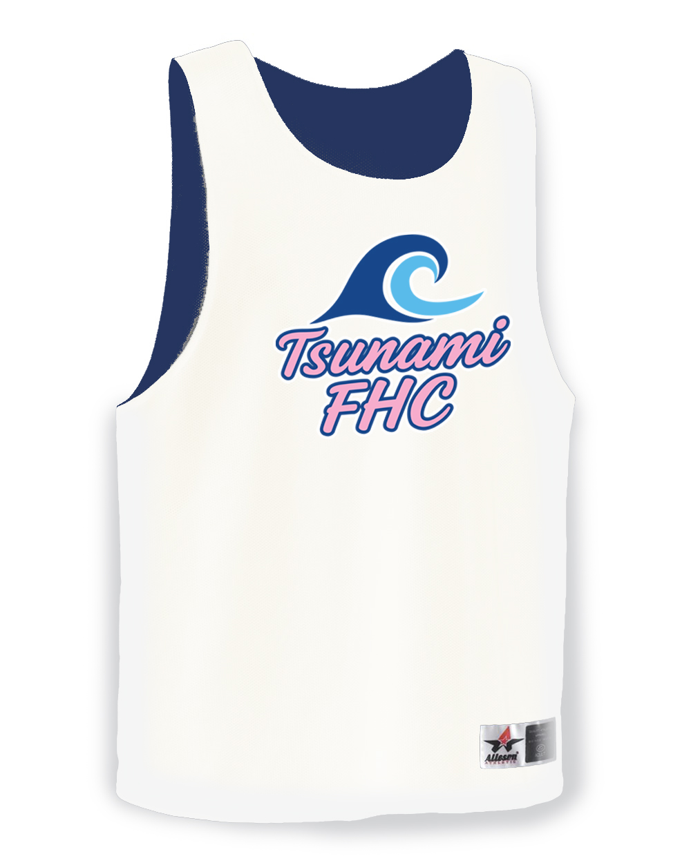 The Tsunami Club Pinnie is reversible, Navy on one side and White on the other. Both sides have the Tsunami Logo. 100% polyester