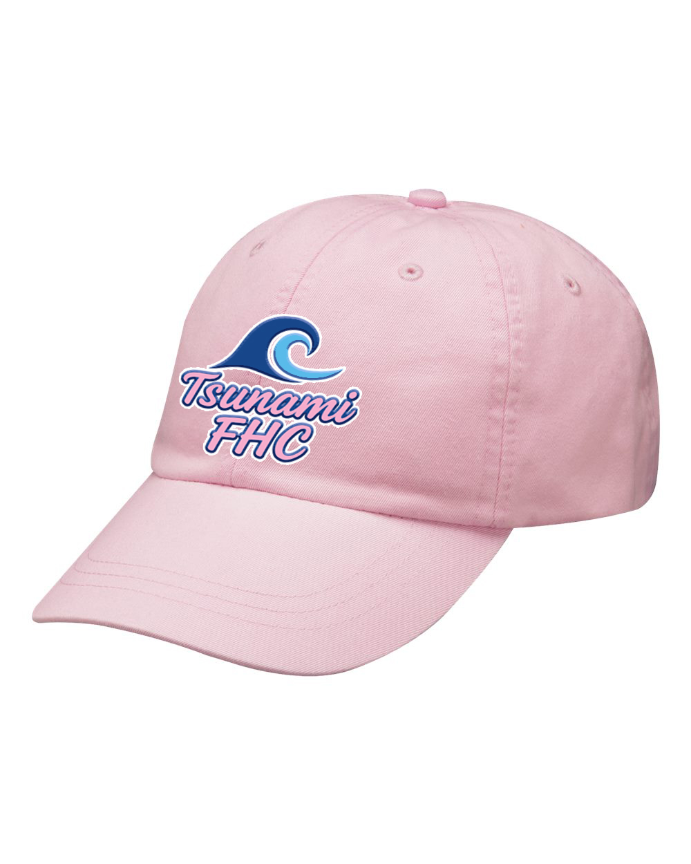This Tsunami logo un-structured hat is 100% cotton, Features 6-panel, Mid-profile, Pre-curved visor, Adjustable self-fabric strap with hideaway side buckle, Made in the USA