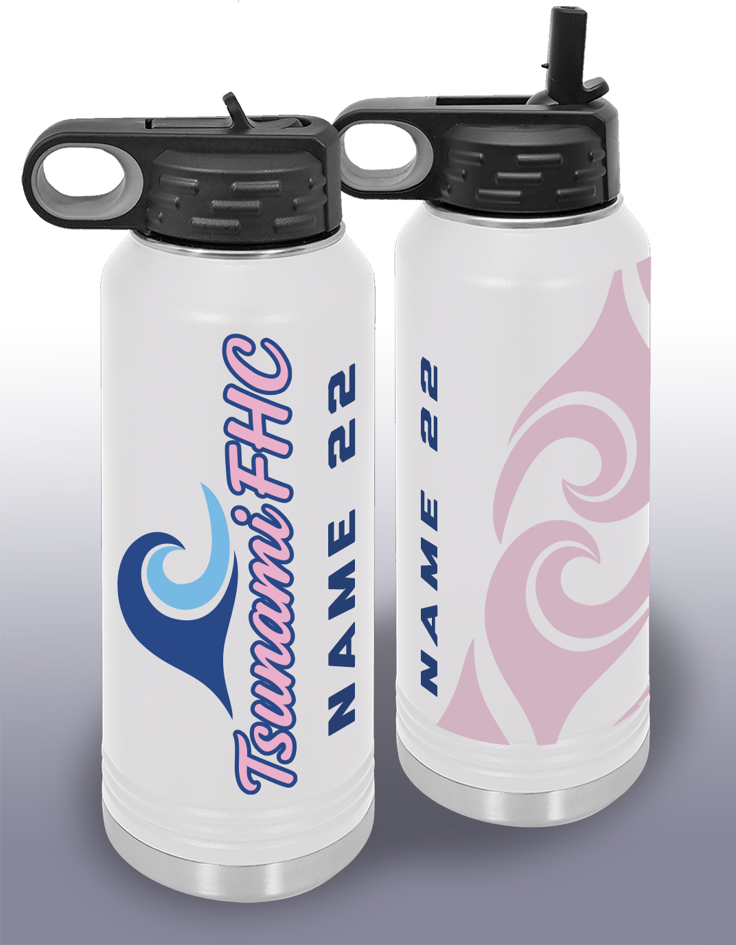 This Tsunami logo 32oz Steel double wall vacuum insulated water bottle is powder coated and printed with the Tsunami logos and player name and number. The bottle is rated 8 hour hot and 16 hour cold.