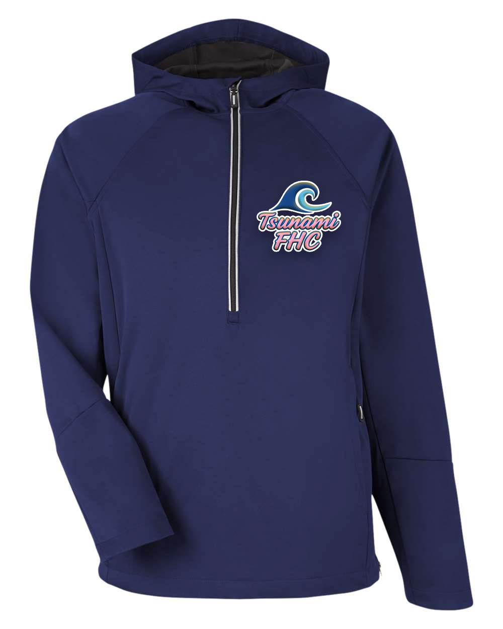 CE711 Tsunami logo super comfortable and water resistant zip pullover is: 8 oz./yd²/270 gsm (US), 3-Layer 100% polyester, 8,000 mm waterproof rating, 1,000 g breathability rating, Interlock bonded to polyester birdseye with inner membrane, Shock cord at hood and hem, Adjustable cuff with metal snaps, Reverse coil zipper with reflective rubber toggle, Right zipper and eyelets for added ventilation and comfort, Reflective piping details